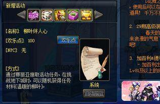 3. 新活动:除了新副本和新装备,DNF还准备了丰富的活动,让玩家们在游戏中畅享春日欢乐。以下是一些精彩活动: